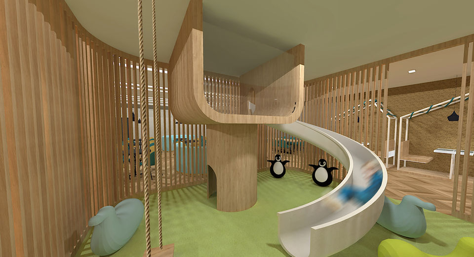 Progetto di un ristorante per la famiglia, con spazi raccolti dedicati agli adulti e al contempo aree gioco per bambini.